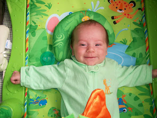 Well, 11 weeks into motherhood and it's more fun, more exciting (and often more tiring) than I could have ever imagined! Owen is laughing out loud and it's so funny! I am glad he thinks I am so amusing. He loves it when I talk with something in my mouth (like my glasses, the burp cloth or his pacifier). He loves when I play peek-a-boo with my sunglasses and when I kiss his belly and sing the "naked baby" song (yes, the naked baby song). He loves his tongue and is so entertained by it and by watching it in the mirror that hangs from his play gym...hours of entertainment!! He is still sleeping through the night from about 10pm to 7am, so he's rested and FULL of energy and so happy first thing in the morning. We have lots of fun then! He smiles so much, but I still can't resist his sad face. Owen has the cutest pouty lip!!! Now while the fun times are really fun, this kid does have a set of lungs on him! When he screams, he screams and I am surprised my family and friends in NC haven't heard it from down here:) He hates to be burped! He has started spitting up more so we burp more frequently. He does not like his meals interrupted! He's just too funny - he has me in stitches most of the time!